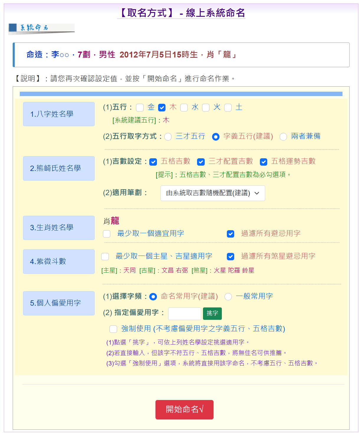【说明】:确认姓名学条件设定无误后,按「开始命名」钮即可开始取名。