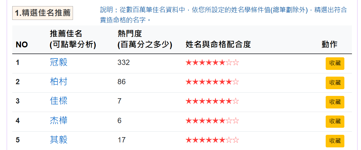 A. 精选佳名推荐:从数百万笔榜单姓名资料中,依您所设定的姓名学条件值,精选出符合贵造命格的名字。