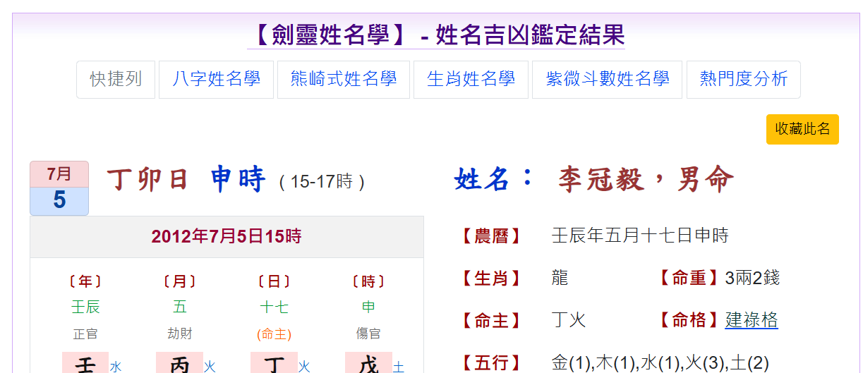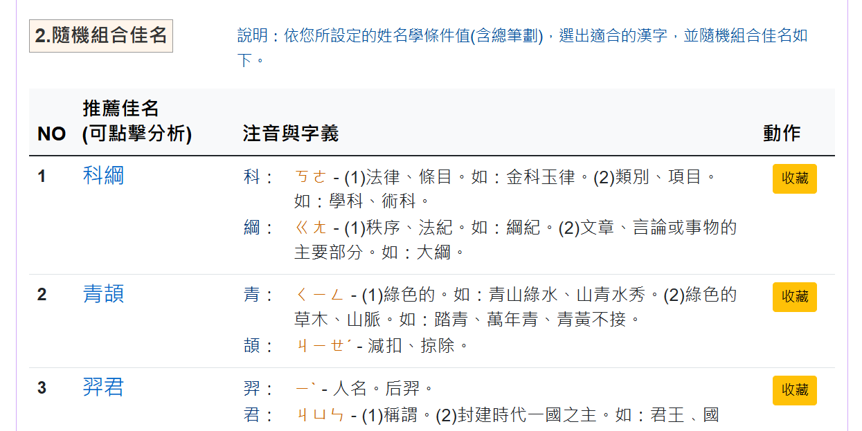 【说明】:可配合姓名学设定,并指定偏爱用字,由系统依榜单精选佳名、随机组合佳名等分类,自动推荐30~60个佳名,并提供姓名吉凶分析、字义解释供参考。
