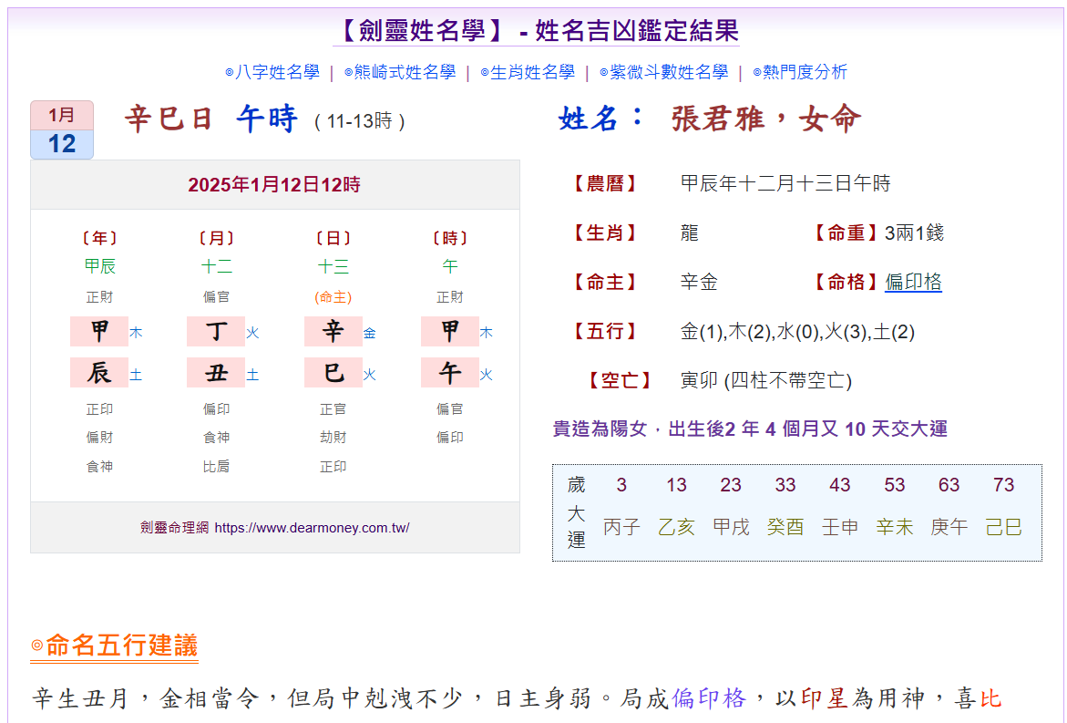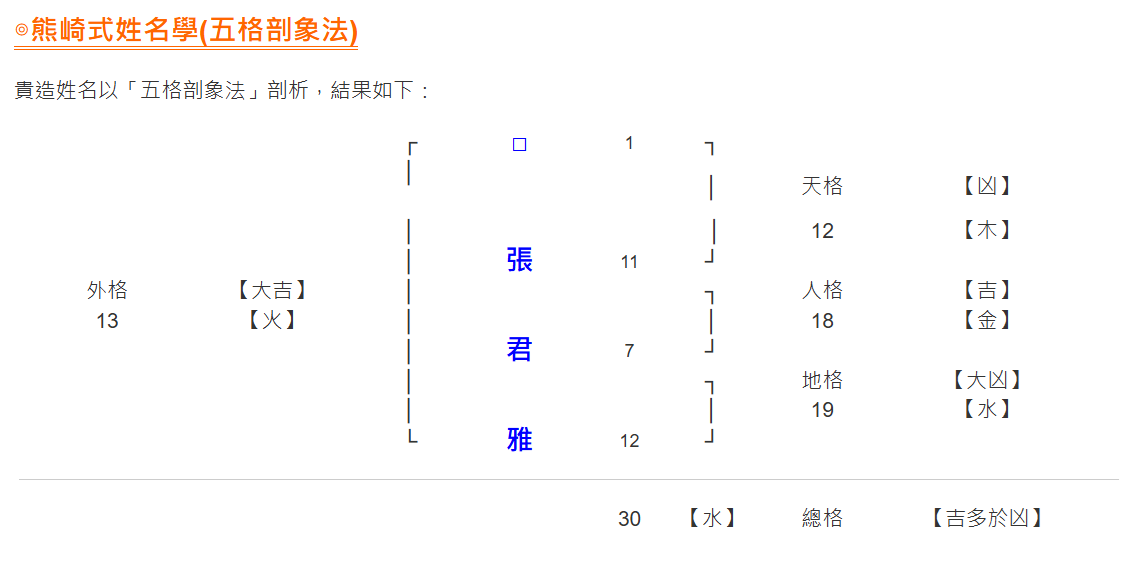 依「数理姓名学」数理音韵架构剖析姓名,剖析结果包含名笔画、综合笔画先天八卦数理五行吉凶等分析。