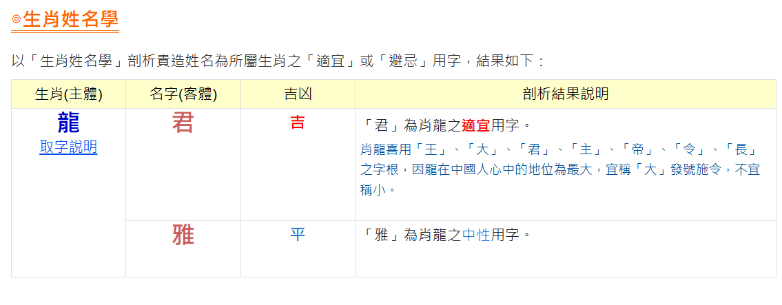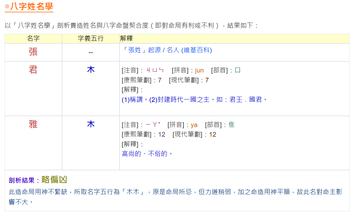 依「八字姓名学」剖析姓名,剖析结果包分析八字命盘,依其五行旺衰强弱,取出命主之喜忌五行,再对照姓名五行,据以判断吉凶。