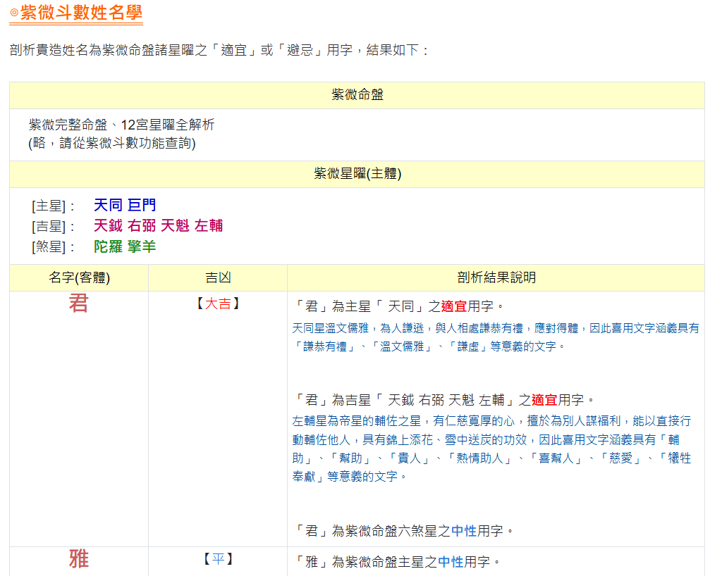 在此步骤,您可以检视姓名吉凶鉴定的结果,内容包含八字姓名学姓名学、生肖姓名学、热门度分析;分析结果并包含字音、字义解释、百家姓来源,让您清楚了解姓名文字涵意。