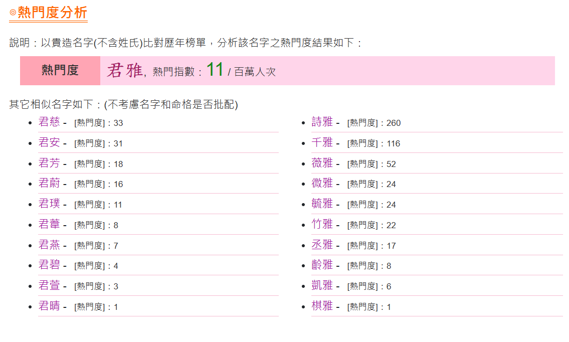 热门度分析是按贵造名字(不含姓氏),比对历年榜单,分析该名字之热门度、诗词佳句,供您参考。