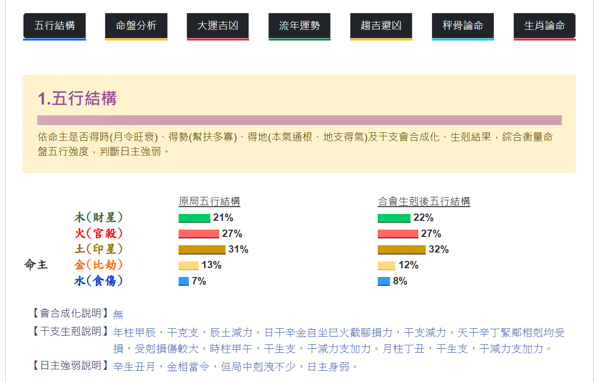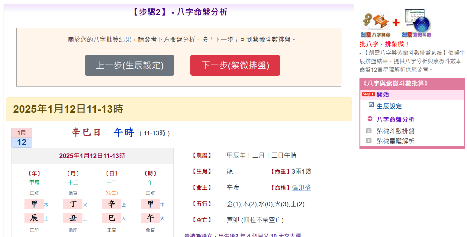 提供八字排盘、五行、格局、用神喜忌、命盘吉凶、运程等分析。在此步骤,系统会分析您的八字,并列出命盘相关资料供您参考。3.1 单人八字分析